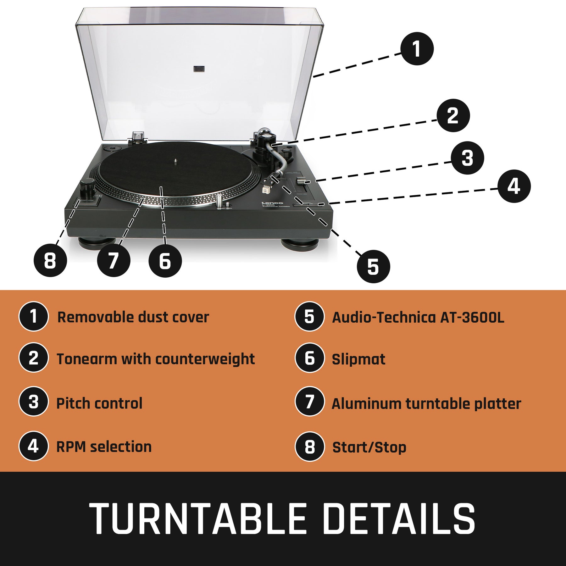 | Accessoires Platine vinyle inclus | Adaptateur 45 TPM, AT3600, Chiffon de nettoyage, Contrepoids, Couvercle anti-poussière, Cellule MMC, Câble d'alimentation, Câble RCA, Tapis de plateau, CD du logiciel |