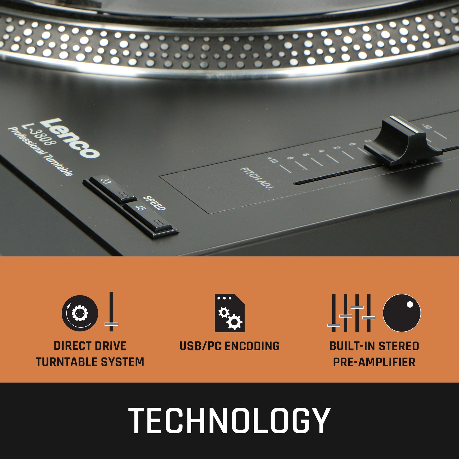 La platine Lenco L-3808 est une platine à entraînement direct qui vous permet de redonner vie à votre collection de vinyles. Elle est tout particulièrement adaptée aux DJ. La platine démarre directement grâce à l’entraînement direct (démarrage rapide). Elle dispose également d’un éclairage pour faciliter l’utilisation et d’un stroboscope.