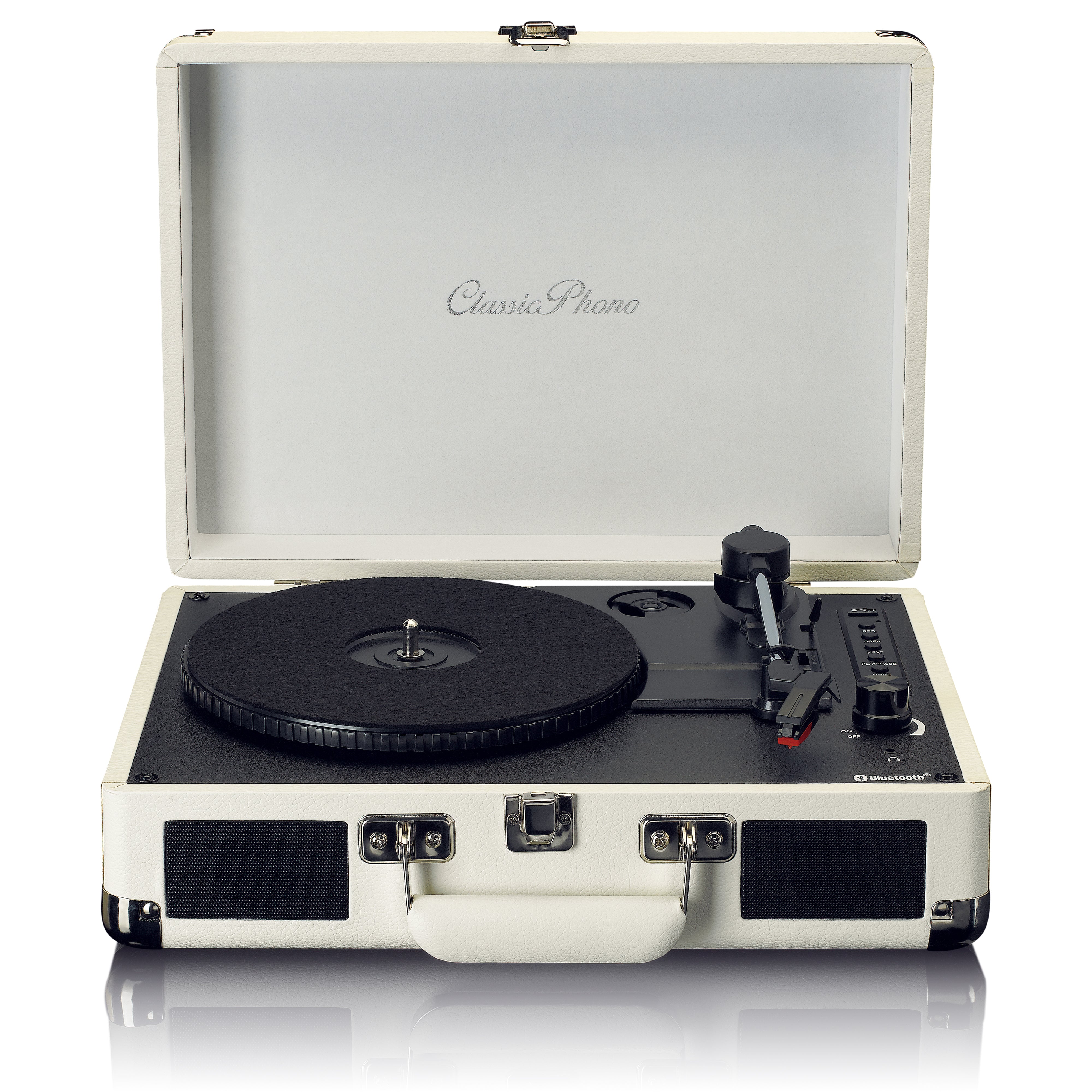 Cette platine vinyle Bluetooth est disponible en deux coloris : noir et crème.