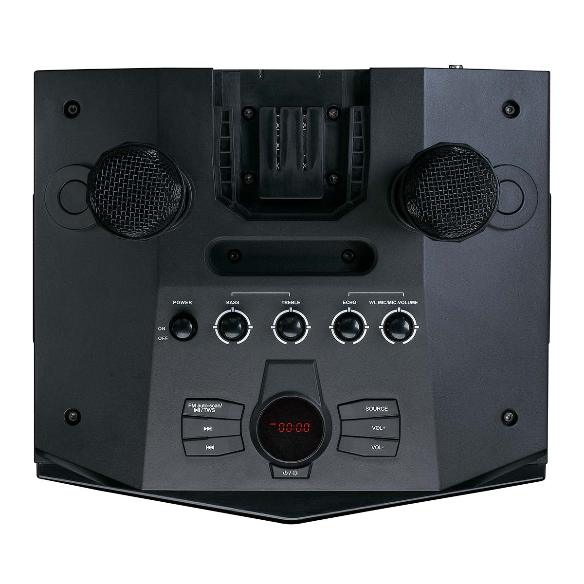 Pas de fête réussie sans cette enceinte PA-220 ! L’éclairage à l’avant vous permet de transformer immédiatement la pièce en véritable boîte de nuit. Les effets lumineux peuvent être adaptés au rythme de la musique. Deux microphones sans fil, qui permettent de chanter au rythme de la musique, sont également fournis. Vous n’avez pas envie de chanter ? Vous pouvez facilement ranger les microphones dans les supports prévus à cet effet sur l’enceinte.