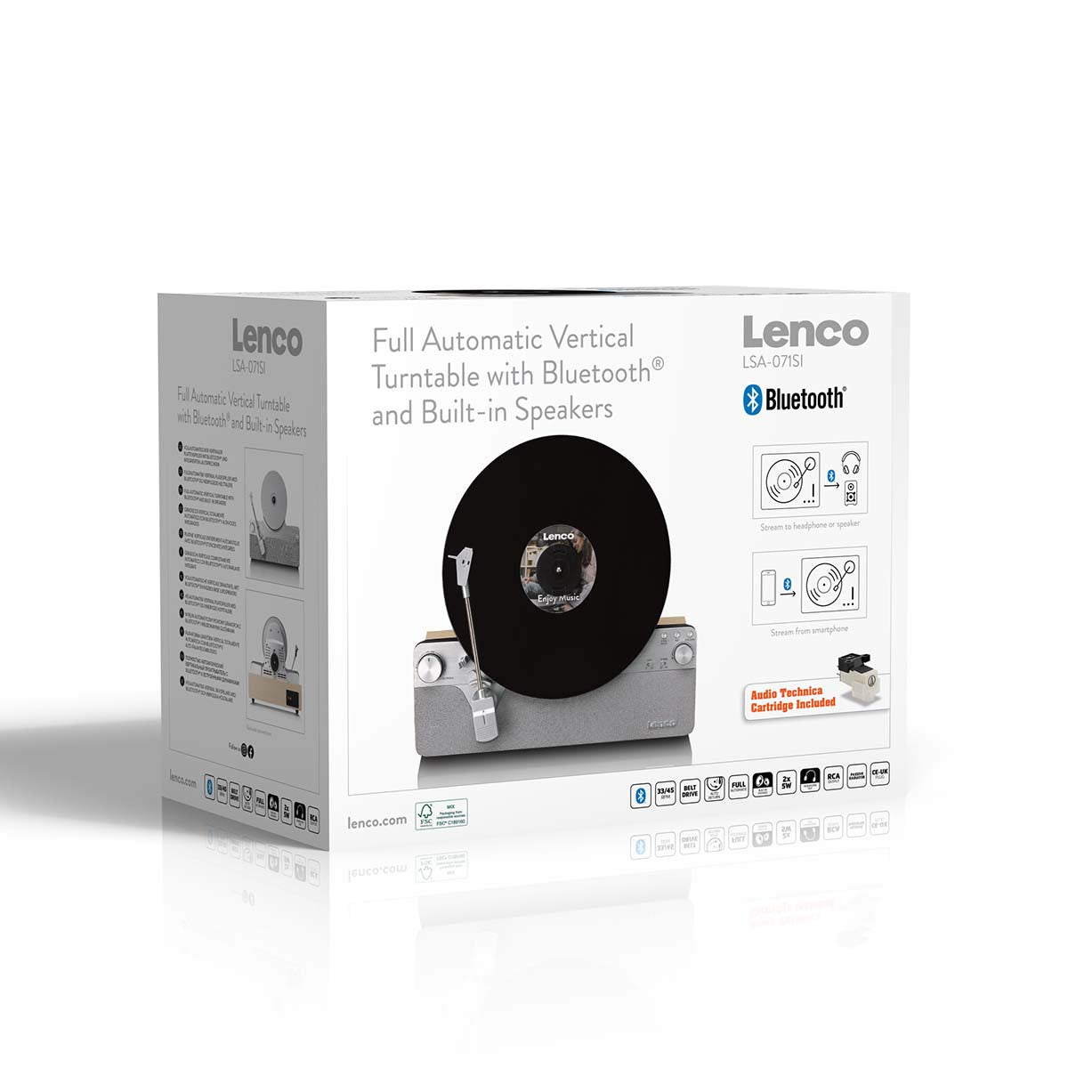 Une platine vinyle Lenco au design vertical ? Un rêve qui devient réalité ! Avec la révolutionnaire Lenco LSA-071SI, vous combinez le charme du vinyle avec un design innovant et esthétiquement plaisant qui étonnera tous les amateurs de musique. La Lenco LSA-071SI est une platine vinyle verticale entièrement automatique avec haut-parleurs intégrés et Bluetooth®, conçue pour offrir une expérience d’écoute unique tout en ajoutant une touche élégante à votre intérieur. Faire tourner un disque en position verticale est un défi technique, mais avec la LSA-071SI, cela n’affecte en rien la qualité sonore ! Ceci grâce à son entraînement par courroie stable, son amplificateur stéréo intégré, sa cellule Audio-Technica AT-3600L de haute qualité et ses fonctionnalités entièrement automatiques. Découvrez comment la Lenco LSA-071SI donne vie à votre collection de vinyles, verticalement et automatiquement !