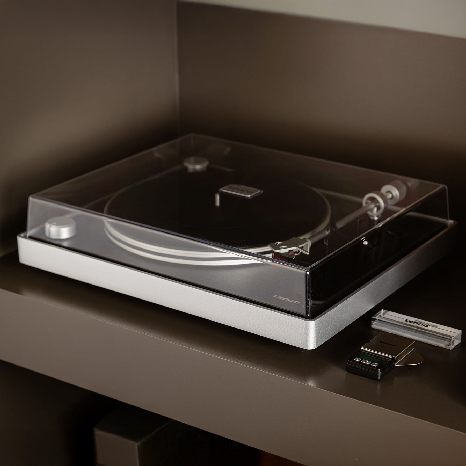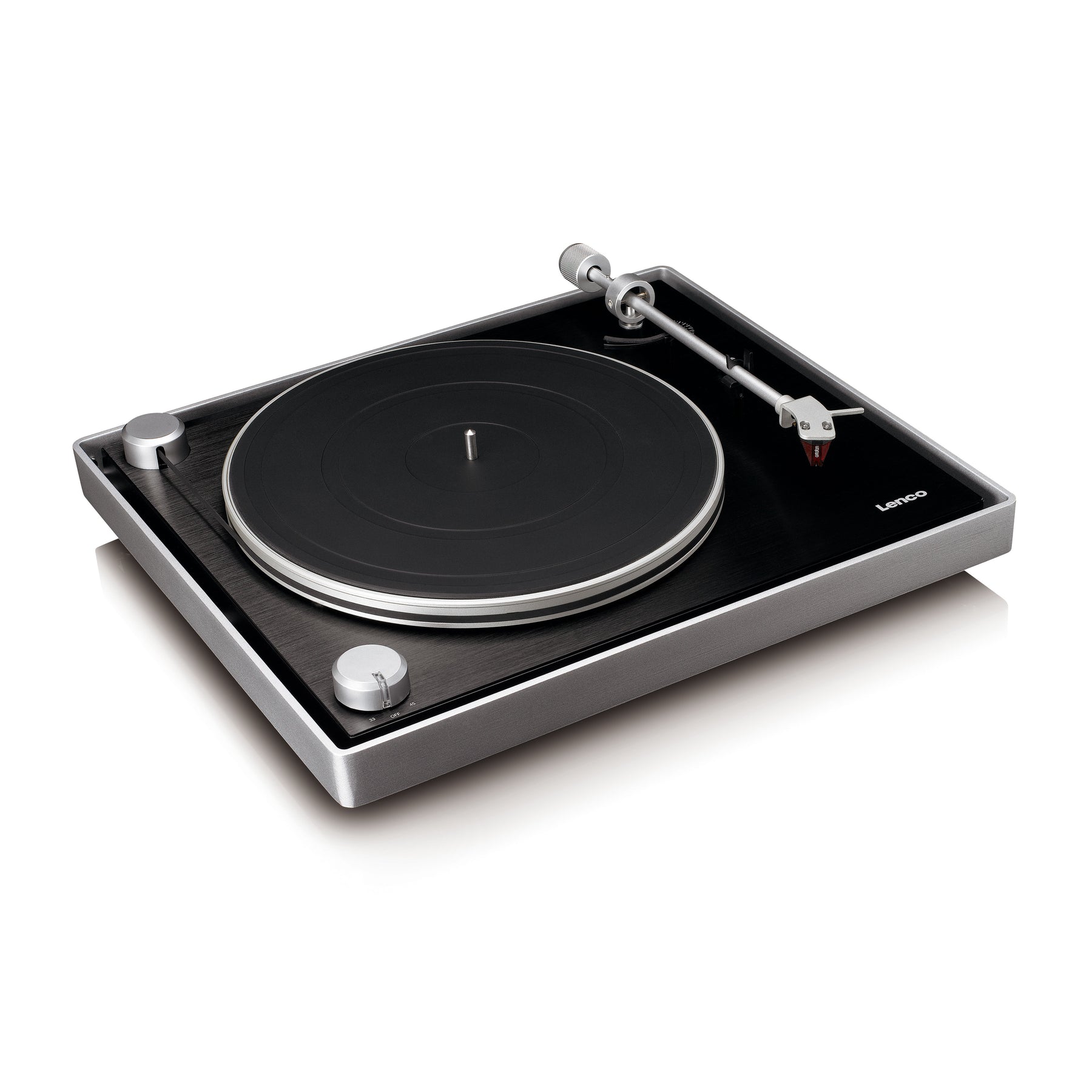 Un simple regard sur la Lenco L-455BK révèle immédiatement l’harmonie entre la finition noire élégante et le cadre en aluminium brossé. Cette finition haut de gamme confère à la platine un aspect luxueux, tandis que le bras de lecture ne passe pas inaperçu. Le bras minimaliste présente un design épuré et fonctionnel. Le plateau en métal raffiné dégage une élégance qui s’intègre parfaitement à l’ensemble. Et ce n’est pas tout : nous n’avons même pas encore parlé de la cellule !